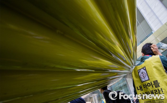 (서울=포커스뉴스)영국과 덴마크에서 옥시레킷벤키저 본사와 케톡스 본사를 항의 방문했던 가습기 살균제 피해자 유족과 시민단체가 11일 오후 서울 영등포구 여의도 옥시 한국본사 앞에서 열린 귀국 기자회견을 마친 후 자리를 정리하고 있다.