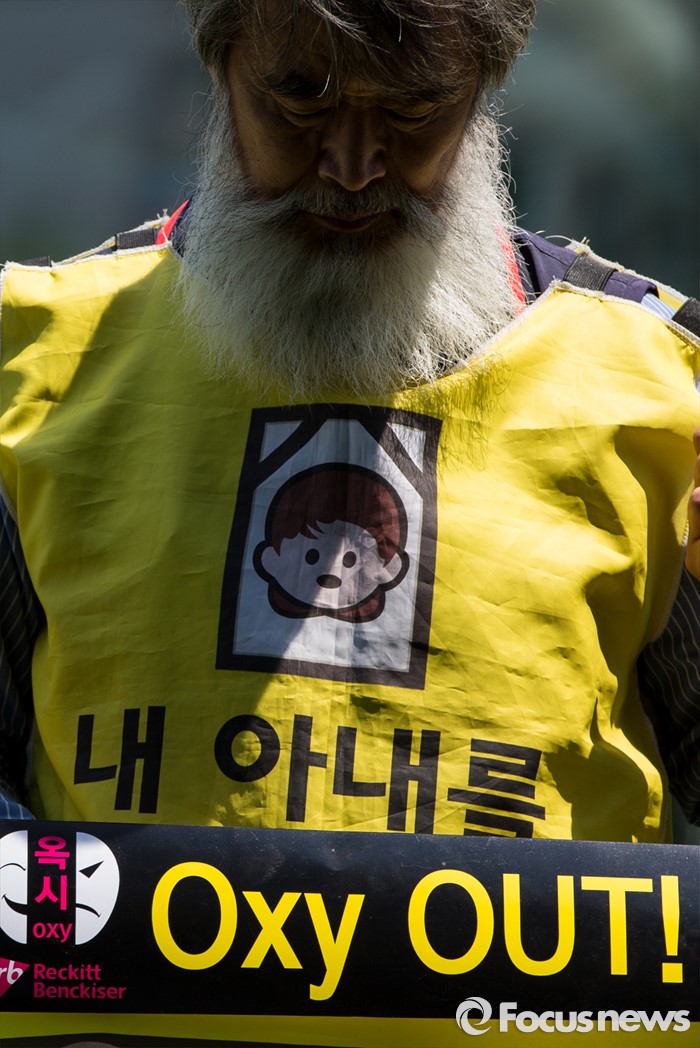 (서울=포커스뉴스)영국과 덴마크에서 옥시레킷벤키저 본사와 케톡스 본사를 항의 방문했던 가습기 살균제 피해자 유족과 시민단체가 11일 오후 서울 영등포구 여의도 옥시 한국본사 앞에서 열린 귀국 기자회견에 참석해 옥시를 규탄하는 손팻말을 들고 있다.