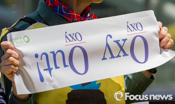 (서울=포커스뉴스)영국과 덴마크에서 옥시레킷벤키저 본사와 케톡스 본사를 항의 방문했던 가습기 살균제 피해자 유족과 시민단체가 11일 오후 서울 영등포구 여의도 옥시 한국본사 앞에서 열린 귀국 기자회견에 참석해 옥시를 규탄하는 손팻말을 들고 있다.