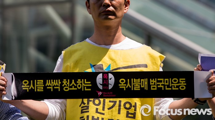 (서울=포커스뉴스)영국과 덴마크에서 옥시레킷벤키저 본사와 케톡스 본사를 항의 방문했던 가습기 살균제 피해자 유족과 시민단체가 11일 오후 서울 영등포구 여의도 옥시 한국본사 앞에서 열린 귀국 기자회견에 참석해 옥시를 규탄하는 손팻말을 들고 있다.