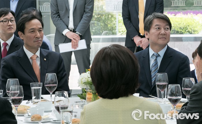(서울=포커스뉴스) 11일 오후 서울 여의도 국회 의원회관에서 열린 20대 국회 초선의원 의정연찬회 오찬에 참석한 우상호(왼쪽) 더불어민주당 원내대표와 안철수 국민의당 상임공동대표가 정의화 국회의장의 오찬사를 듣고 있다.