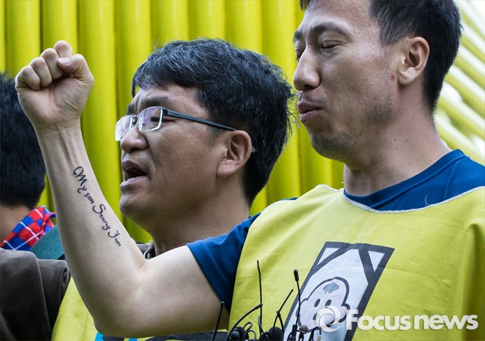 (서울=포커스뉴스)영국과 덴마크에서 옥시레킷벤키저 본사와 케톡스 본사를 항의 방문했던 가습기 살균제 피해자 유족 김덕종(40)씨가 11일 오후 서울 영등포구 여의도 옥시 한국본사 앞에서 열린 귀국 기자회견에 참석해 옥시를 규탄하는 구호를 외치고 있다. 김씨의 팔에 가습기 살균제 피해로 세상을 떠난 아들 승준군을 기리는 문신이 새겨져 있다.