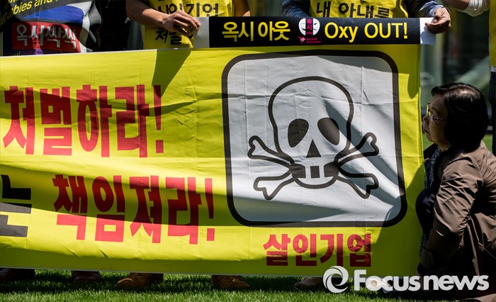 (서울=포커스뉴스)영국과 덴마크에서 옥시레킷벤키저 본사와 케톡스 본사를 항의 방문했던 가습기 살균제 피해자 유족과 시민단체가 11일 오후 서울 영등포구 여의도 옥시 한국본사 앞에서 귀국 기자회견을 갖고 있다.