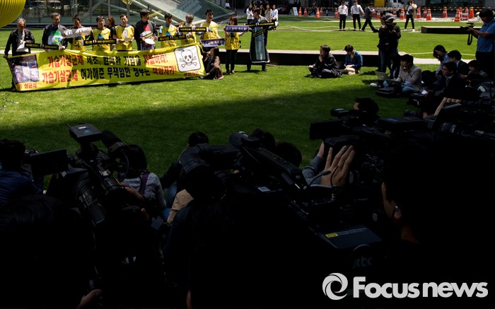 (서울=포커스뉴스)영국과 덴마크에서 옥시레킷벤키저 본사와 케톡스 본사를 항의 방문했던 가습기 살균제 피해자 유족과 시민단체가 11일 오후 서울 영등포구 여의도 옥시 한국본사 앞에서 귀국 기자회견을 갖고 있다.