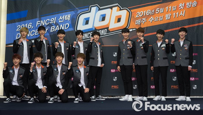 (서울=포커스뉴스) 11일 오후 서울 마포구 스탠포드 호텔에서 열린 Mnet 'Dance or Band' 제작발표회에 참석한 Fnc 엔터테인먼트 소속 댄스팀(왼쪽)과 밴드팀이 포즈를 취하고 있다.
