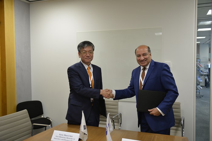 (서울=포커스뉴스) EBRD 연차총회 참석을 위해 런던을 방문 중인 최상목(왼쪽) 기획재정부 1차관이 수마 차크라바티 EBRD 총재와 경제 협력 강화 방안을 논의 후 악수를 하고 있다. <사진제공=기획재정부>