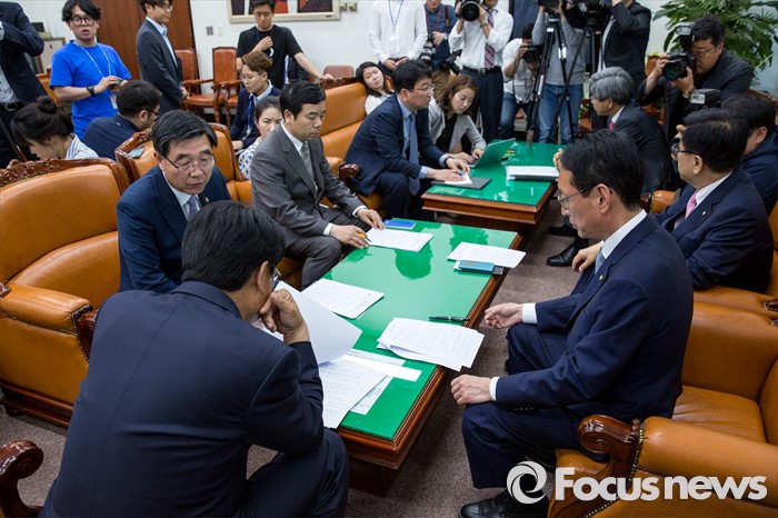 (서울=포커스뉴스) 정진석(가운데) 새누리당 원내대표가 11일 오후 서울 여의도 국회에서 이기권 고용노동부 장관에게 노동개혁 관련 주요 현안 보고를 받고 있다.
