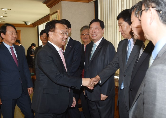 (서울=포커스뉴스) 유일호 부총리 겸 기획재정부 장관이 11일 서울 중구 은행연합회에서 열린 중국진출 활성화 간담회에서 참석기업 대표들과 악수하며 인사를 하고 있다. <사진제공=기획재정부>