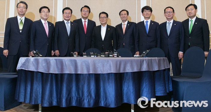 (서울=포커스뉴스) 11일 오후 서울 여의도 국회 귀빈식당에서 열린 3당 원내지도부 회동에 참석한 의원들이 취재진을 향해 포즈를 취하고 있다. 왼쪽부터 왼쪽부터 김성식 국민의당 정책위의장, 김광림 새누리당 정책위의장, 변재일 더불어민주당 정책위의장, 정진석 새누리당 원내대표, 박지원 국민의당 원내대표, 우상호 더불어민주당 원내대표, 박완주 원내수석부대표, 김도읍 새누리당 원내수석부대표, 김관영 국민의당 원내수석부대표.