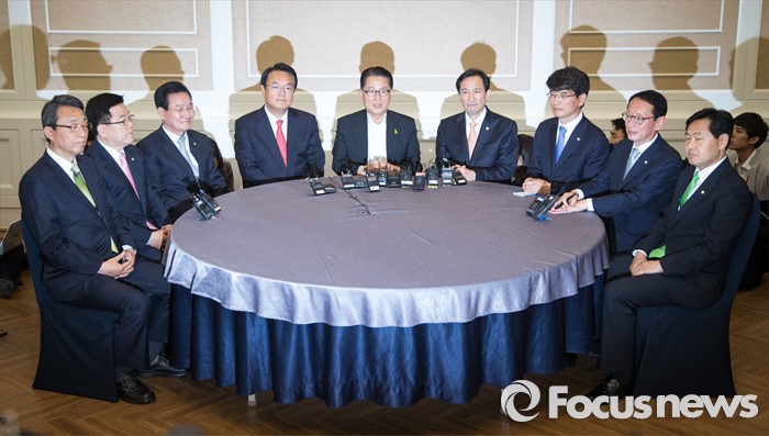 (서울=포커스뉴스) 11일 오후 서울 여의도 국회 귀빈식당에서 열린 3당 원내지도부 회동에 참석한 의원들이 취재진을 향해 포즈를 취하고 있다. 왼쪽부터 김성식 국민의당 정책위의장, 김광림 새누리당 정책위의장, 변재일 더불어민주당 정책위의장, 정진석 새누리당 원내대표, 박지원 국민의당 원내대표, 우상호 더불어민주당 원내대표, 박완주 원내수석부대표, 김도읍 새누리당 원내수석부대표, 김관영 국민의당 원내수석부대표.