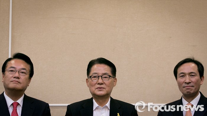 (서울=포커스뉴스) 11일 오후 서울 여의도 국회 귀빈식당에서 열린 3당 원내지도부 회동에 참석한 박지원 국민의당 원내대표가 모두발언을 하고 있다. 왼쪽부터 정진석 새누리당 원내대표, 박지원 국민의당 원내대표, 우상호 더불어민주당 원내대표.