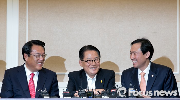(서울=포커스뉴스) 11일 오후 서울 여의도 국회 귀빈식당에서 열린 3당 원내지도부 회동에 참석한 정진석(왼쪽부터) 새누리당 원내대표, 박지원 국민의당 원내대표, 우상호 더불어민주당 원내대표가 미소 짓고 있다.
