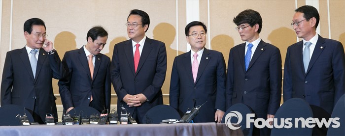 (서울=포커스뉴스) 11일 오후 서울 여의도 국회 귀빈식당에서 열린 3당 원내지도부 회동에 참석한 의원들이 국민의당 의원들을 기다리고 있다. 왼쪽부터 변재일 더불어민주당 정책위의장, 우상호 원내대표, 정진석 새누리당 원내대표, 김광림 정책위의장, 박완주 더불어민주당 원내수석부대표, 김도읍 새누리당 원내수석부대표.
