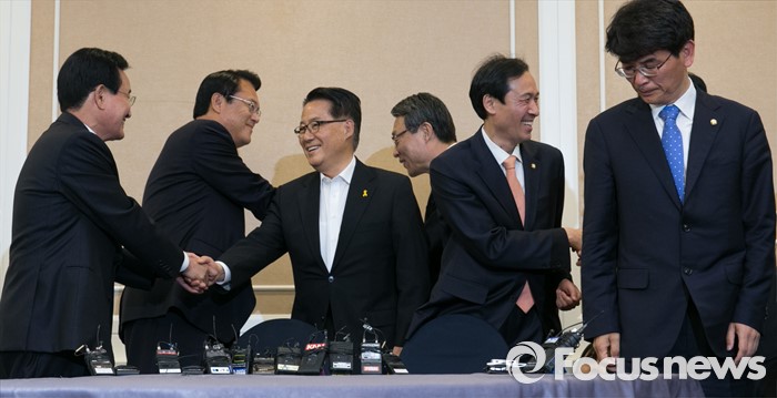 (서울=포커스뉴스) 11일 오후 서울 여의도 국회 귀빈식당에서 열린 3당 원내지도부 회동에 참석한 의원들이 인사하고 있다. 왼쪽부터 변재일 더불어민주당 정책위의장, 정진석 새누리당 원내대표, 박지원 국민의당 원내대표, 김성식 정책위의장, 우상호 더불어민주당 원내대표, 박완주 원내수석부대표.