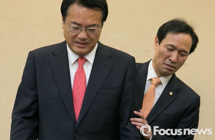 (서울=포커스뉴스) 11일 오후 서울 여의도 국회 귀빈식당에서 열린 3당 원내지도부 회동에 참석한 정진석(왼쪽) 새누리당 원내대표와 우상호 더불어민주당 원내대표가 자리를 옮기고 있다.