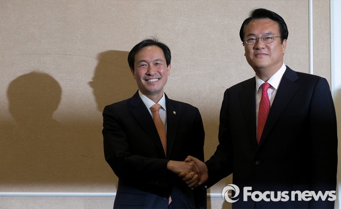 (서울=포커스뉴스) 11일 오후 서울 여의도 국회 귀빈식당에서 열린 3당 원내지도부 회동에 참석한 정진석(오른쪽) 새누리당 원내대표와 우상호 더불어민주당 원내대표가 악수하고 있다.