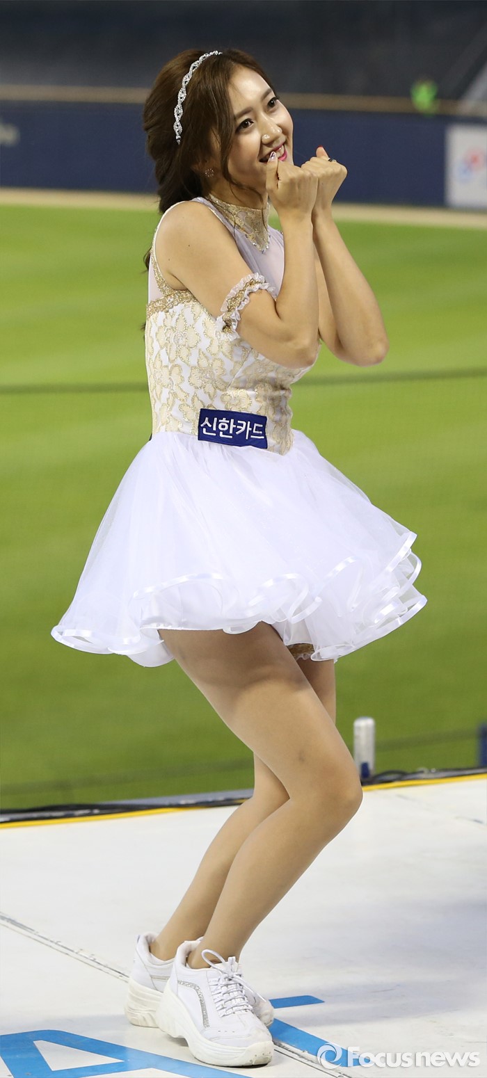 (서울=포커스뉴스) 11일 서울 잠실구장에서 열린 2016 프로야구 삼성-LG 경기에서 LG 치어리더가 순백의 짧은 치마를 입고 정열적인 안무로 관중들의 시선을 모으고 있다.