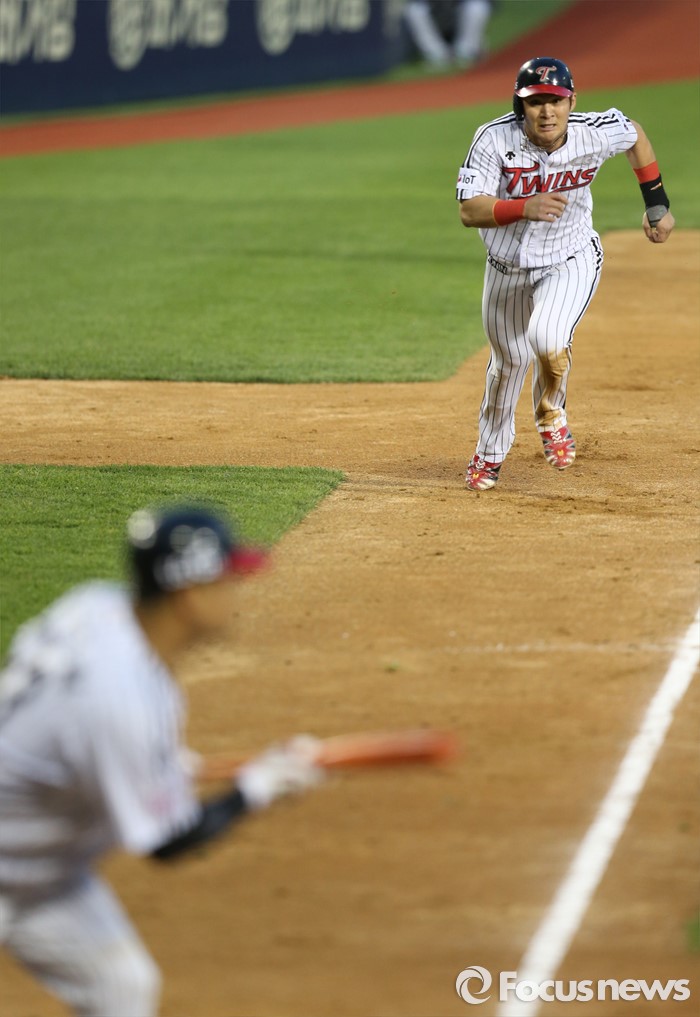 (서울=포커스뉴스) 11일 서울 잠실구장에서 열린 2016 프로야구 삼성-LG 경기 3회말 1사 3루에서 LG 최경철이 스퀴즈 번트를 시도하며 3루주자 오지환이 홈으로 쇄도하고 있다. 번트는 파울이 되었다.