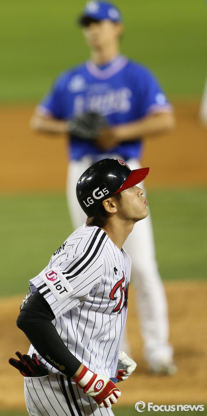 (서울=포커스뉴스) 11일 서울 잠실구장에서 열린 2016 프로야구 삼성-LG 경기 4회말 2사 1,2루에서 LG 이형종이 몸에 맞는 볼로 출루하고 있다.