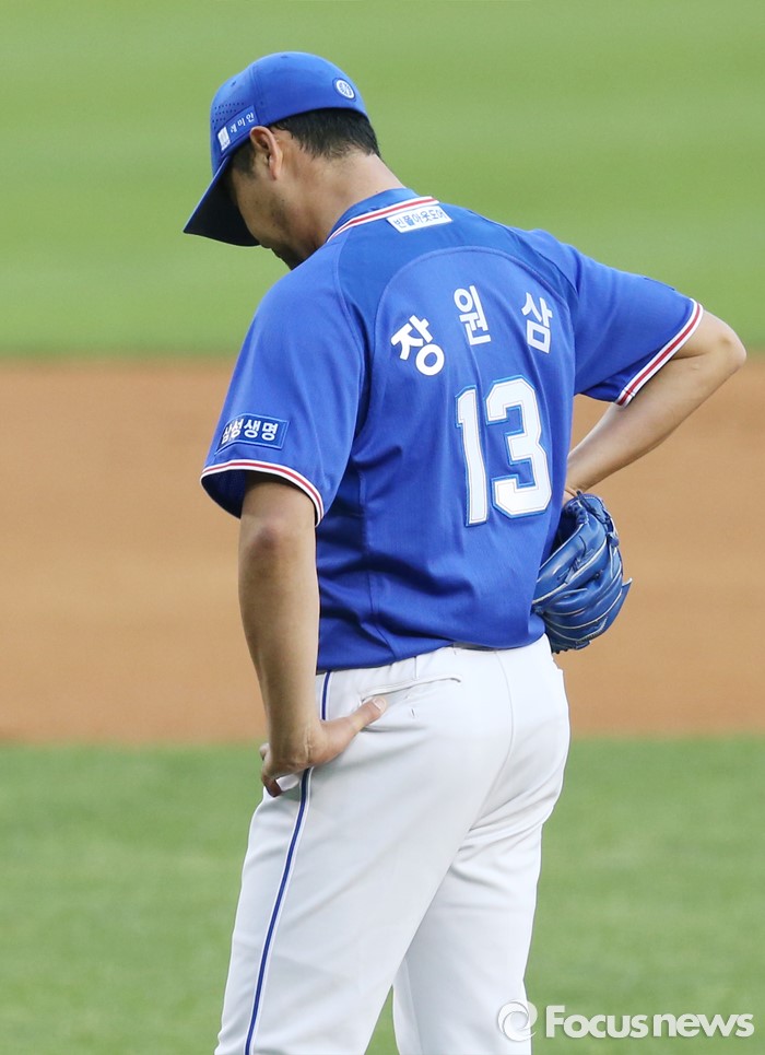 (서울=포커스뉴스) 11일 서울 잠실구장에서 열린 2016 프로야구 삼성-LG 경기 2회말 2사 2루에서 삼성 투수 장원삼이 LG 박용택에게 안타를 맞아 실점한후 고개를 떨구고 있다.
