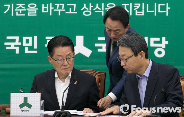 (서울=포커스뉴스) 12일 오전 서울 여의도 국회에서 열린 국민의당 원내정책조정회의에 참석한 박지원(왼쪽부터) 원내대표, 김명진 원내대표비서실장, 김성식 정책위의장이 대화하고 있다.