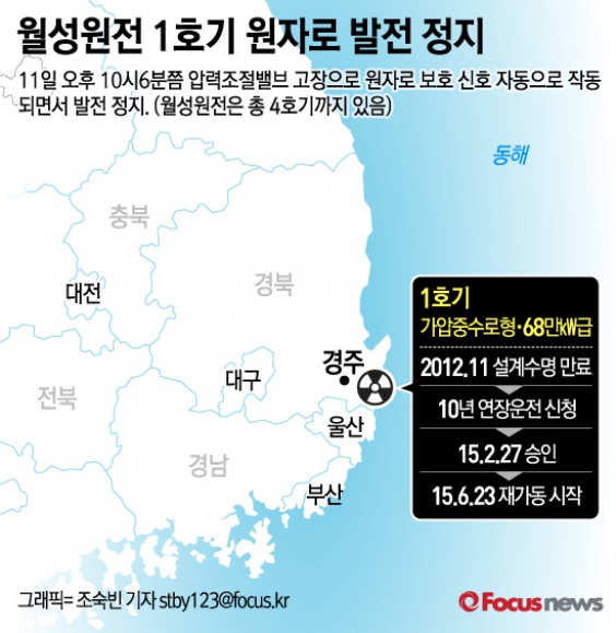 (서울=포커스뉴스) 12일 한국수력원자력 월성원자력본부는 지난 11일 경북 경주의 월성원전 1호기(가압중수로형·68만㎾급)가 11일 오후 10시6분쯤 고장으로 발전을 정지했다고 밝혔다.