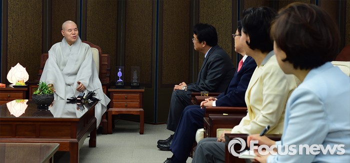 (서울=포커스뉴스) 정진석(오른쪽 네 번째) 새누리당 원내대표가 12일 오전 서울 종로구 조계사에서 자승 대한불교조계종 총무원장을 예방 하고 있다.