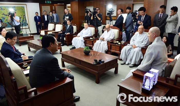 (서울=포커스뉴스) 정진석(왼쪽 세 번째) 새누리당 원내대표가 12일 오전 서울 종로구 조계사에서 자승 대한불교조계종 총무원장을 예방 하고 있다.