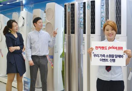 한편, 전자랜드는 여름을 앞두고 에어컨과 선풍기 등 여름 제품들을 다양하게 준비하고 있다. 최근 에어컨을 찾는 소비자가 증가하면서 5월 첫 주 에어컨 판매량은 스탠드형 기준으로 전년 동기 판매량보다 11% 늘었다.전자랜드는 다음달 30일까지 '우리가족 소원을 말해봐' 이벤트를 진행한다.