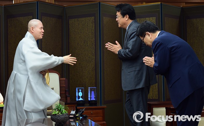 (서울=포커스뉴스) 정진석(오른쪽 두 번째) 새누리당 원내대표가 12일 오전 서울 종로구 조계사에서 자승 대한불교조계종 총무원장을 예방해 인사 하고 있다.