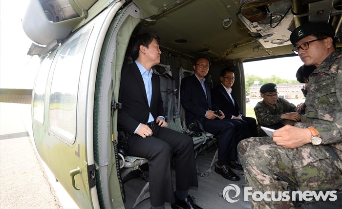 (서울=포커스뉴스) 안철수(왼쪽부터) 국민의당 상임공동대표, 김성식 정책위의장, 박지원 원내대표가 12일 오전 경기도 연천의 전방부대를 방문하기 위해 고양 수색비행장에서 헬기에 탑승하고 있다.