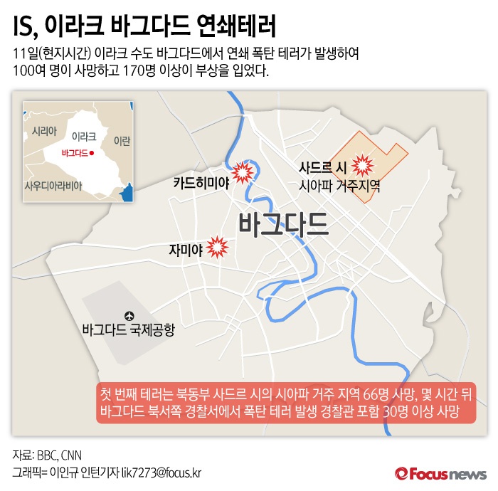(서울=포커스뉴스) 외신에 따르면 11일(현지시간) 이라크 수도 바그다드에서 올해 들어 최악의 연쇄 폭탄 테러가 발생해 100여 명이 사망하고 170명 이상이 부상을 입었다.