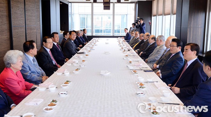 (서울=포커스뉴스) 정진석(왼쪽 다섯번째) 새누리당 원내대표 등이 12일 오후 서울 여의도 한 중식당에서 상임고문단과 오찬을 하고 있다.