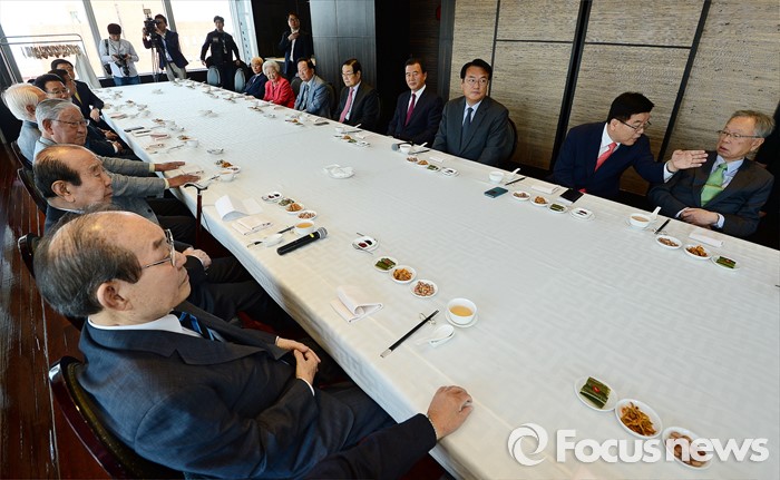 (서울=포커스뉴스) 정진석(오른쪽 세번째) 새누리당 원내대표와 김광림(오른쪽 두번째) 정책위의장 등이 12일 오후 서울 여의도 한 중식당에서 상임고문단과 오찬을 하고 있다.