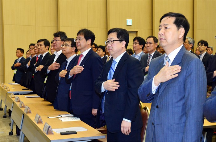 (세종=포커스뉴스) 박춘섭(오른쪽 두 번째) 기획재정부 예산실장이 12일 오전 세종시정부세종청사 컨센션센터에서 열린 2016년 지방재정협의회에 참석해 국기에 대한 경례를 하고 있다. <사진제공=기획재정부>