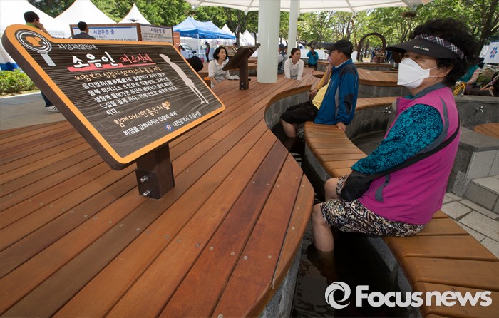 (대전=포커스뉴스) 유성온천문화축제를 하루 앞둔 12일 오전 대전 유성구 유성온천문화공원 족욕장을 찾은 시민들이 족욕을 하고 있다. 유성온천문화축제는 13일부터 15일까지 열리며 국내 최초로 한방족욕카페를 개장해 태양인과 태음인, 소양인, 소음인 사상체질별 맞춤 족욕장을 운영한다.