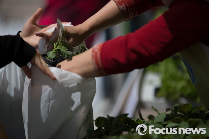 (서울=포커스뉴스) 12일 오후 서울시청 광장에서 열린 채소 모종 나눔행사에 참석한 시민들이 채소 모종이 담긴 봉지를 가져가고 있다.