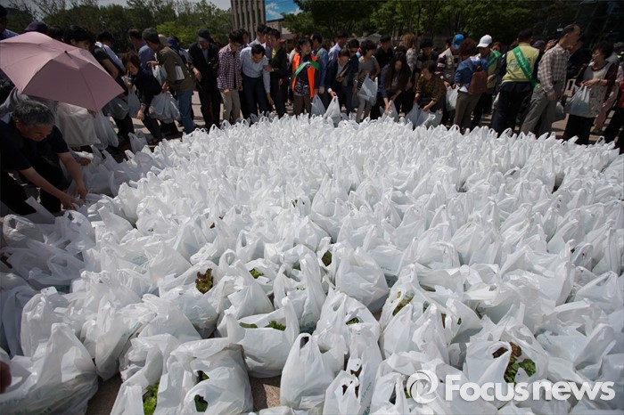 (서울=포커스뉴스) 12일 오후 서울시청 광장에서 열린 채소 모종 나눔행사에 참석한 시민들이 채소 모종이 담긴 봉지를 가져가고 있다.