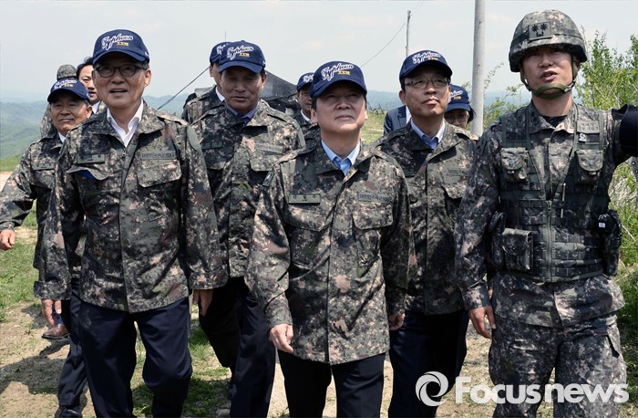 (연천=포커스뉴스) 안철수(오른쪽 세번째) 국민의당 상임공동대표, 박지원(왼쪽 두번째) 원내대표, 김성식(오른쪽 두번째) 정책위의장 등 의원 및 당선인들이 12일 오전 경기도 연천 전방부대를 방문해 북한 및 부대 상황을 보고 받으며 이동하고 있다.