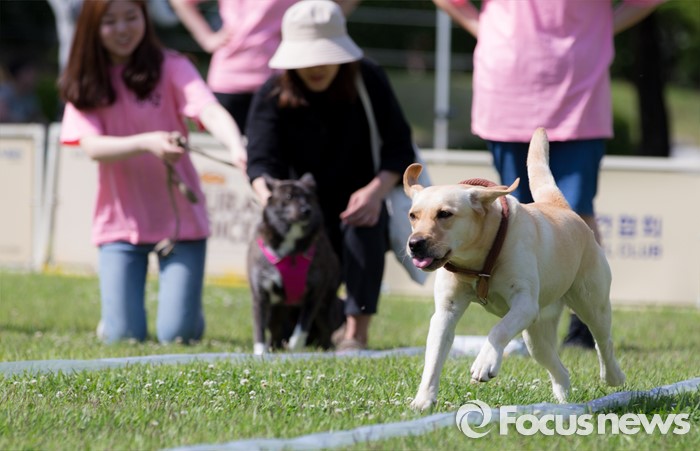 (서울=포커스뉴스) 12일 오후 서울 광진구 건국대학교 잔디광장에서 수의과대학 주최로 열린 '반려견과 함께하는 축제, 반함'에서 반려견들이 주인을 향해 달리고 있다.