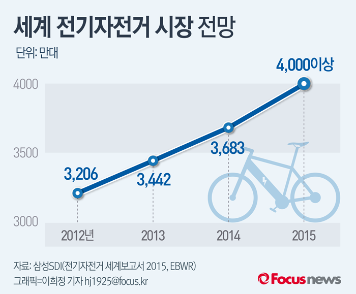 (서울=포커스뉴스) ‘전기자전거 세계보고서 2015 (Electric Bikes Worldwide Report 2015)’에 따르면 2012년 3200만대 수준이던 세계 전기자전거 판매량은 2015년 4000만대로 늘어났다.
