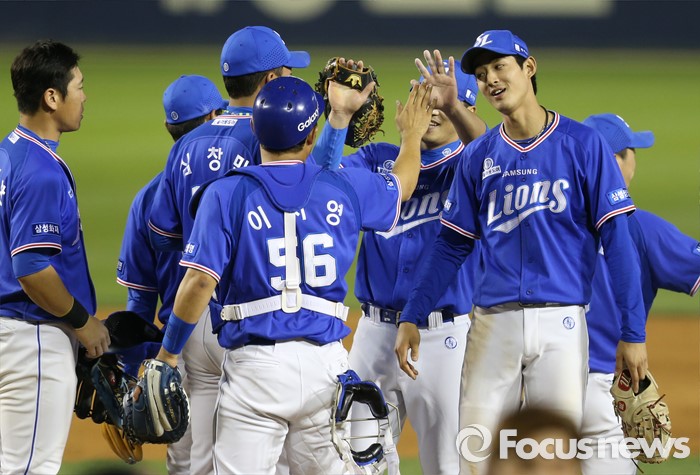 (서울=포커스뉴스) 12일 서울 잠실구장에서 열린 2016 프로야구 삼성-LG 경기에서 LG에 7-5로 승리한 삼성 선수들이 마운드에 모여 하이파이브를 하고 있다.
