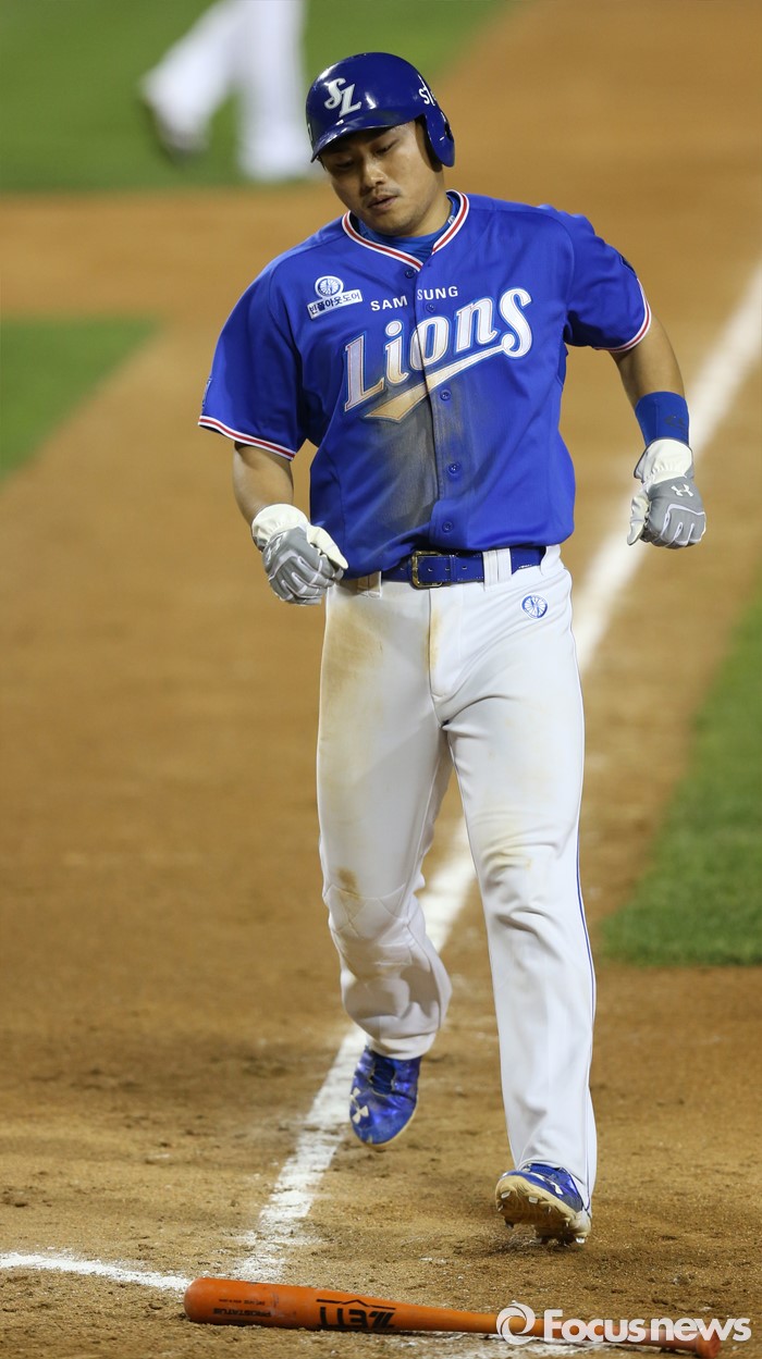 (서울=포커스뉴스) 12일 서울 잠실구장에서 열린 2016 프로야구 삼성-LG 경기 7회초 2사 만루에서 삼성 배영섭의 볼넷으로 3루주자 이지영이 홈인하고 있다.