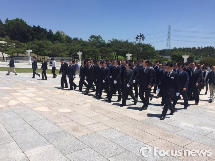 12일 더불어민주당은 20대 총선 당선자 워크숍 참석에 앞서 광주 북구 국립 5·18민주묘지를 참배하고 윤상원 열사의 묘역 앞에서 임을 위한 행진곡을 단체로 제창했다.
