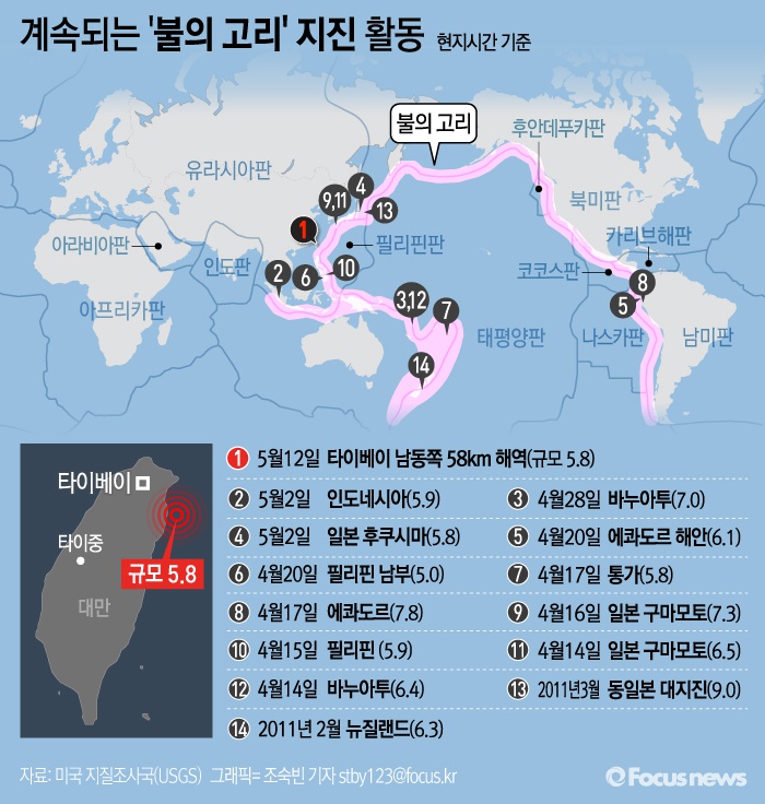 (서울=포커스뉴스) 12일 대만 인근 해역에서 규모 5.8의 지진이 발생한 데 이어 여진이 잇따라 발생했다.