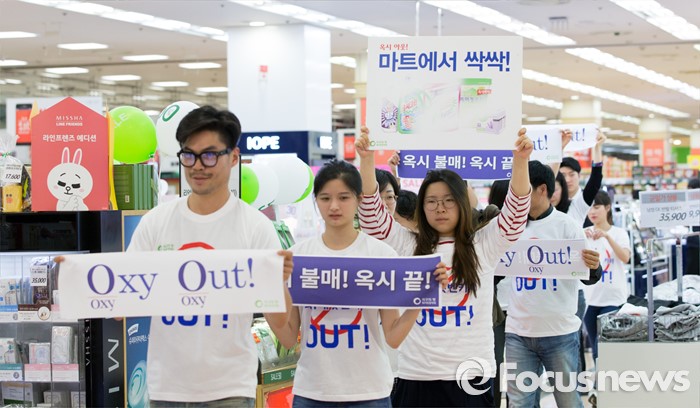 (서울=포커스뉴스) 13일 오전 서울 중구 롯데마트 서울역점에서 환경운동연합과 가습기 살균제 피해자 가족모임이 '옥시 제품 즉각 판매 중단'을 촉구하고 있다.