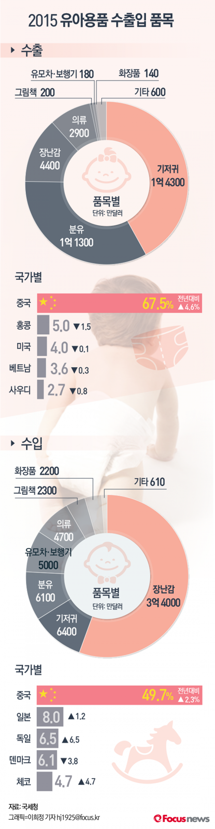 (서울=포커스뉴스)12일 관세청이 공개한 ‘최근 5년간 유아용품 수출입 동향’에 따르면 지난해 한국산 유아용품 중 가장 두각을 나타낸 수출 품목은 1억4300만달러가 수출된 기저귀였다. 수입 품목에서는3억4000만달러로 장난감이 가장 큰 비중을 차지했다. 최대 수출국과 수입국은 모두 중국이 차지했다.