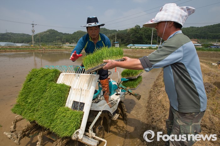(청주=포커스뉴스) 13일 오후 충북 청주시 서원구의 한 논에서 농민이 이양기를 이용해 모내기를 하고 있다.