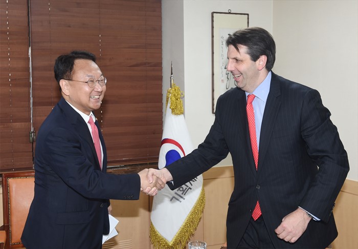 (서울=포커스뉴스) 13일 서울 종로구 정부서울청사에서 유일호(왼쪽) 경제부총리 겸 기획재정부 장관이 마크 리퍼트 주한 미국대사와 면담에 앞서 악수하고 있다. <사진제공=기획재정부>