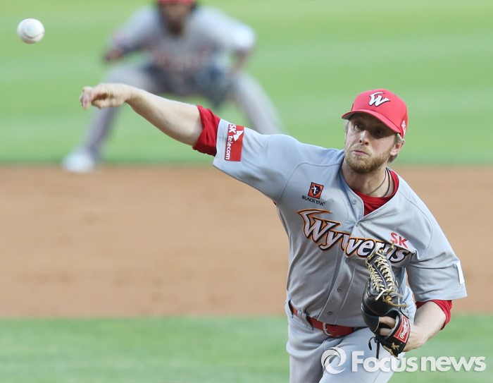 (서울=포커스뉴스) 13일 서울 잠실구장에서 열린 2016 프로야구 SK-LG 경기에서 1회말 SK 선발투수 켈리가 투구하고 있다.